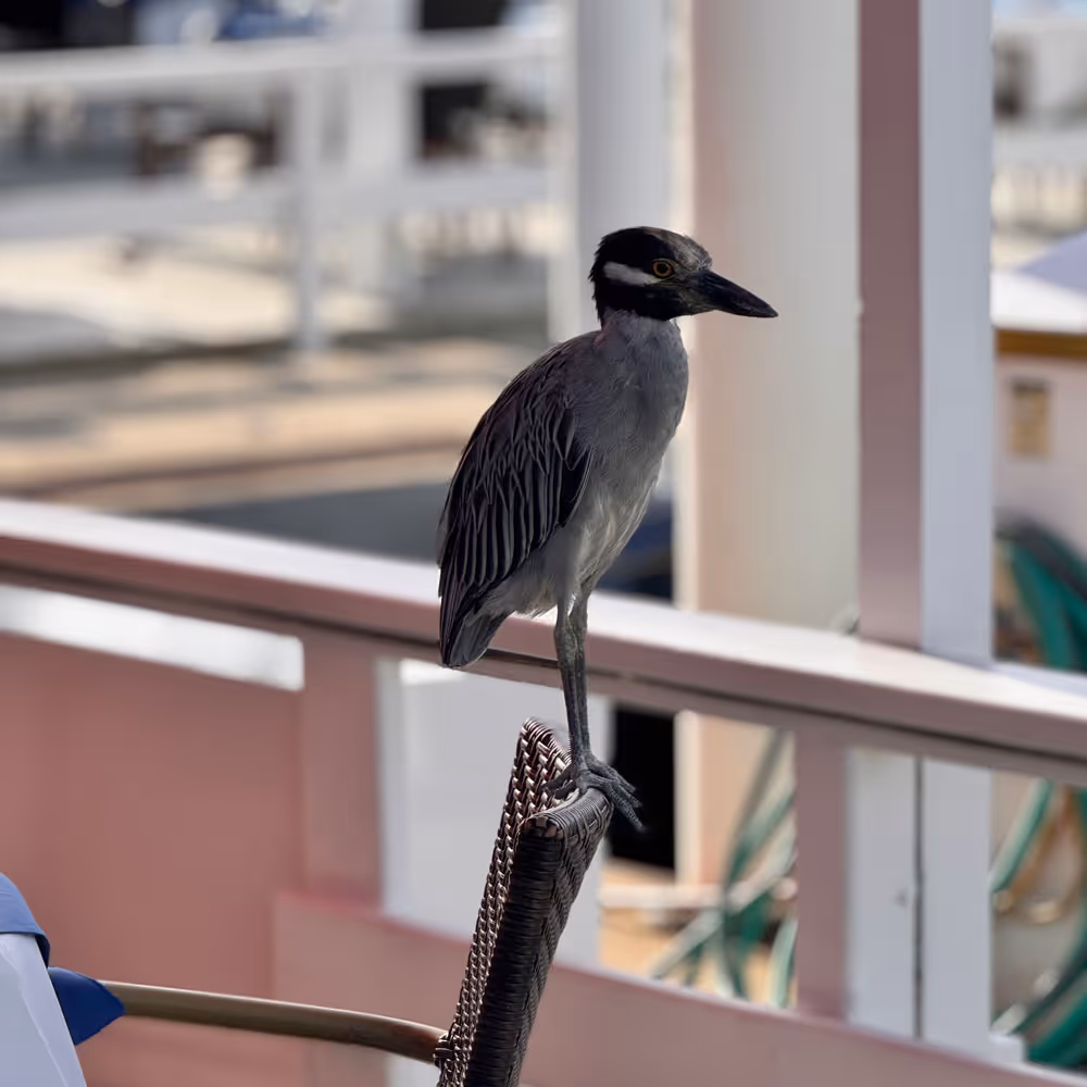 As we finished our cocktails, and as if the day needed another highlight, we were joined by one final island local, an elegant Night heron, perching casually beside us taking in the marina views. And the Piña Coladas? Easily some of the best of the trip.