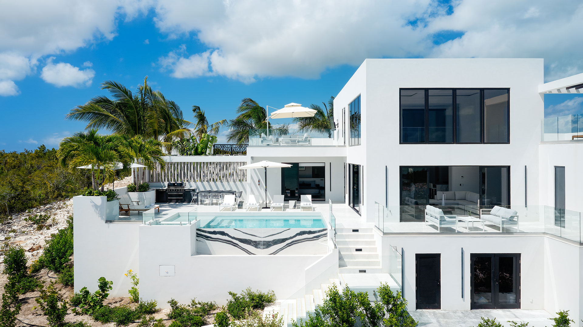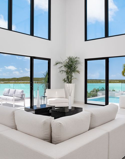 Villa Cielo is an exquisite property with a host of cutting-edge features. Decor is as sleek and timeless as the striking contemporary architecture. Cathedral ceilings accentuate the main two-story windows that frame dramatic panoramic vistas of the turquoise sound from dawn till dusk.