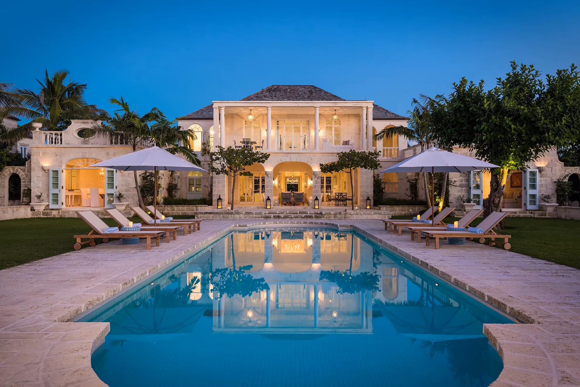 Inside, beautifully decorated kitchen, dining and living spaces in muted natural shades invite quiet relaxation, with glimpses over immaculate lawns and aquamarine waters beyond. Five tranquil guest rooms are designed for restful sleep, with shuttered windows, marble and rattan adorned with luxurious linens. An on-site media room ensures entertainment is just a button away.