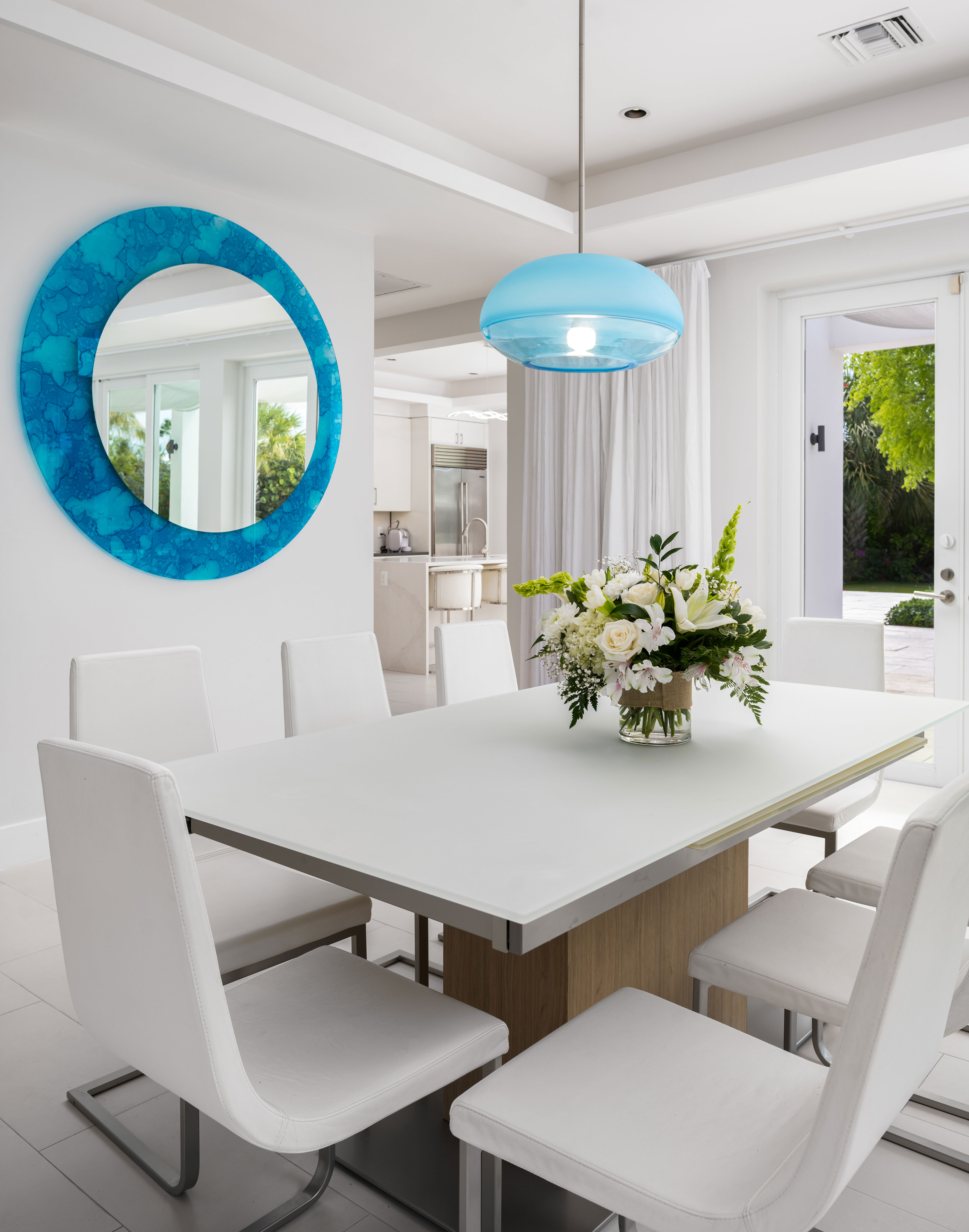 Surrounded by mature tropical trees, with well-tended lawn and borders filled with vibrant foliage, the garden views glimpsed through the windows offer a constant reminder of the natural beauty that surrounds the property. As you step inside, you'll be greeted by cooling white interiors complemented by azure and teal hues that instantly instil a sense of quiet calm.
