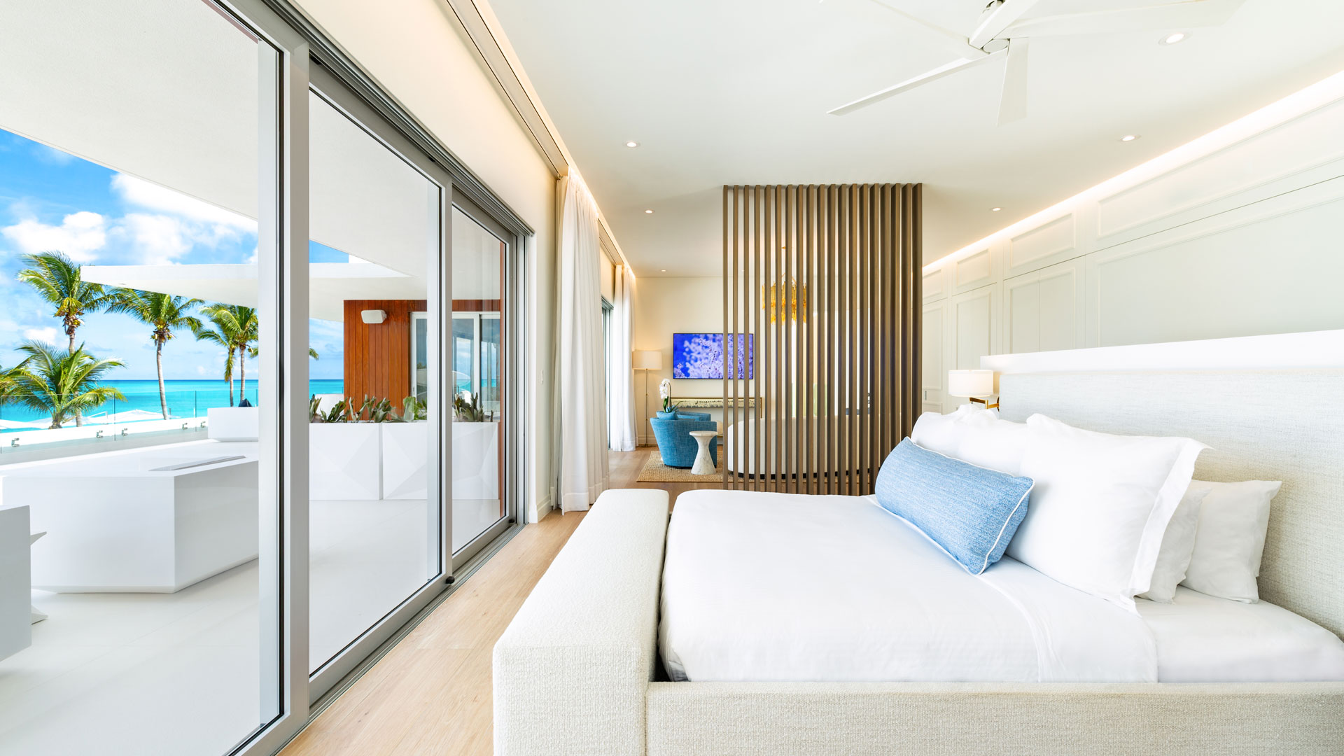 Outside, an immense 100ft sparkling infinity pool monopolises the views on this superb stretch of Grace Bay beach. An outdoor spa, pickle ball, ping pong and basketball facilities, plus state of the art gym and hair salon with manicure/pedicure station, are a luxurious touch, ideal for prepping for sunset soirees. Combined with a host of living, dining and social spaces, beachside firepit and ocean deck, Sole E Mare is the ultimate location for Grace Bay island entertaining.